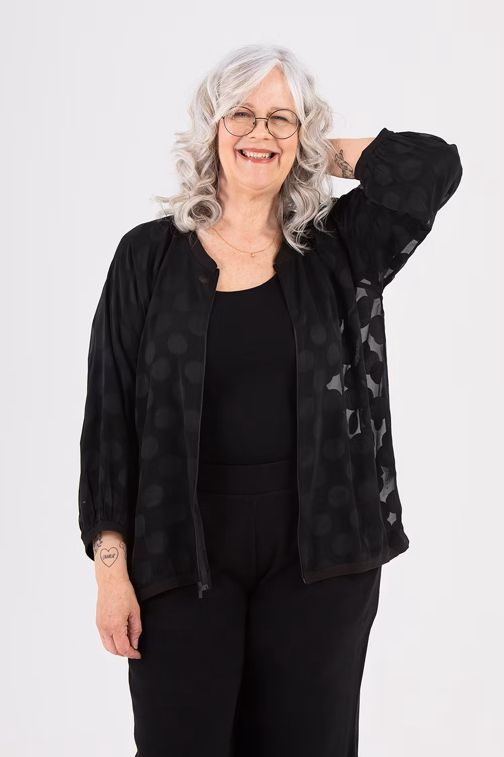 Black lightweight transparent bomber jacket with polka dots in the pattern. Available for you in sizes 42-56. Order yours here!