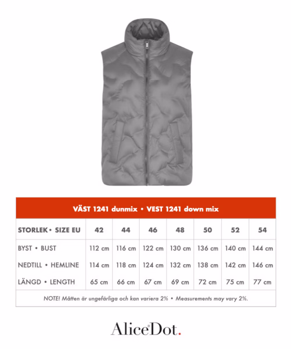 • Skötselråd: Torka bort ytliga fläckar med en våt trasa. När det behövs tvätta västen i maskin 40 grader. Hängtorka.