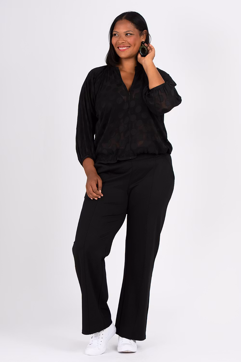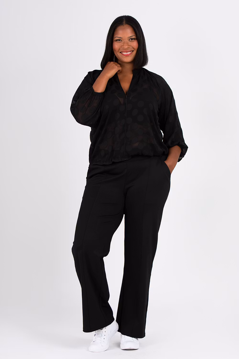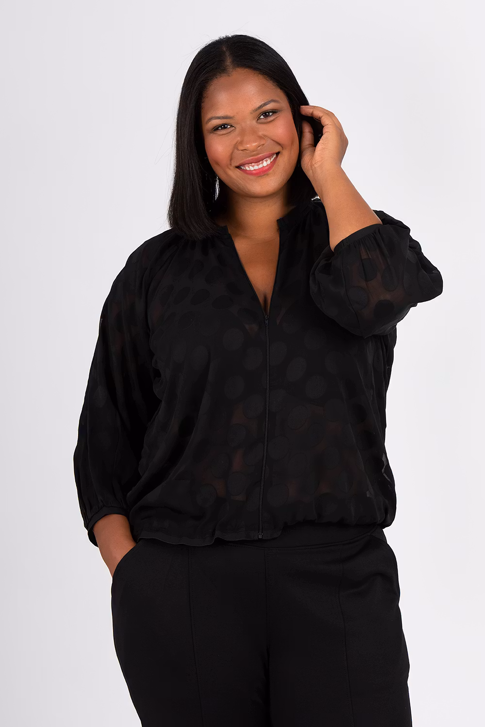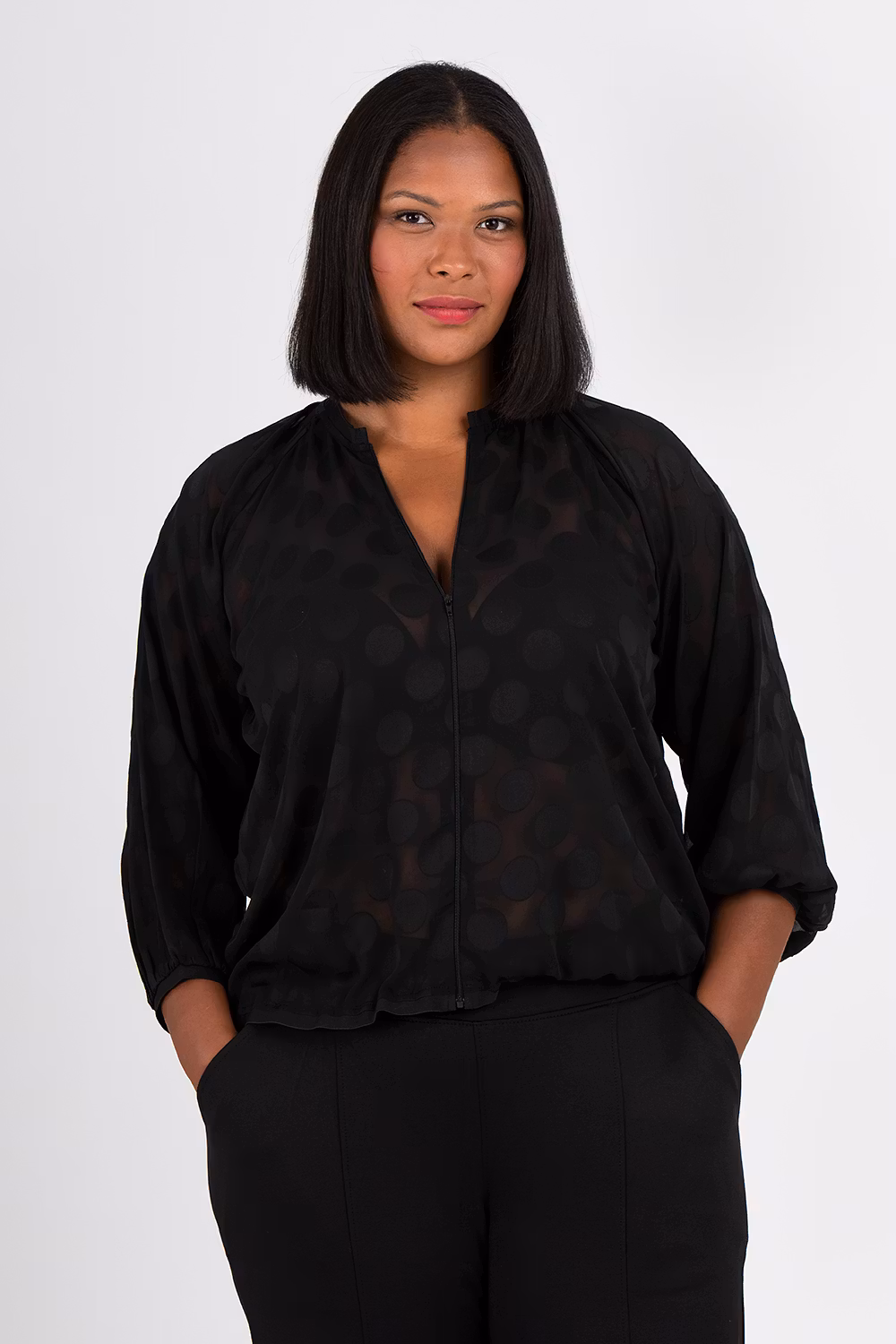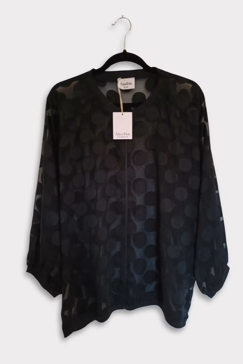 • Halvtransparent tyg av 100% polyester med stora svarta prickar.