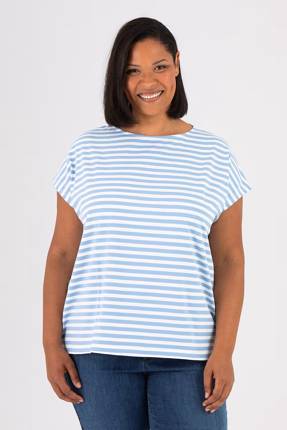Båtringad topp i vid modell av bomullstrikå. Garnfärgade ränder i ljusblått/vitt. Finns i storlekar 42-56. Beställ din här!
