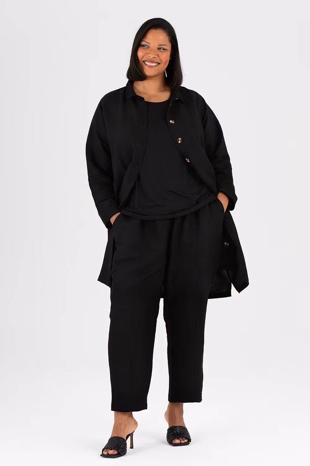 Sval och skön svart långskjorta i linne/viskos. Fickor i sidorna. Välj bland storlekar 42-56.