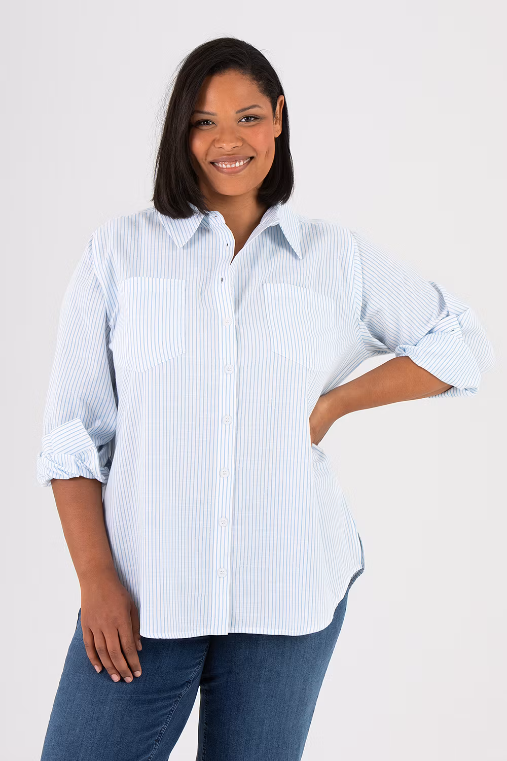 Klassisk somrig skjorta i 100% bomull. Vit med ljusblå ränder i mönstret. Finns i storlekar 42-56. Välj här!
