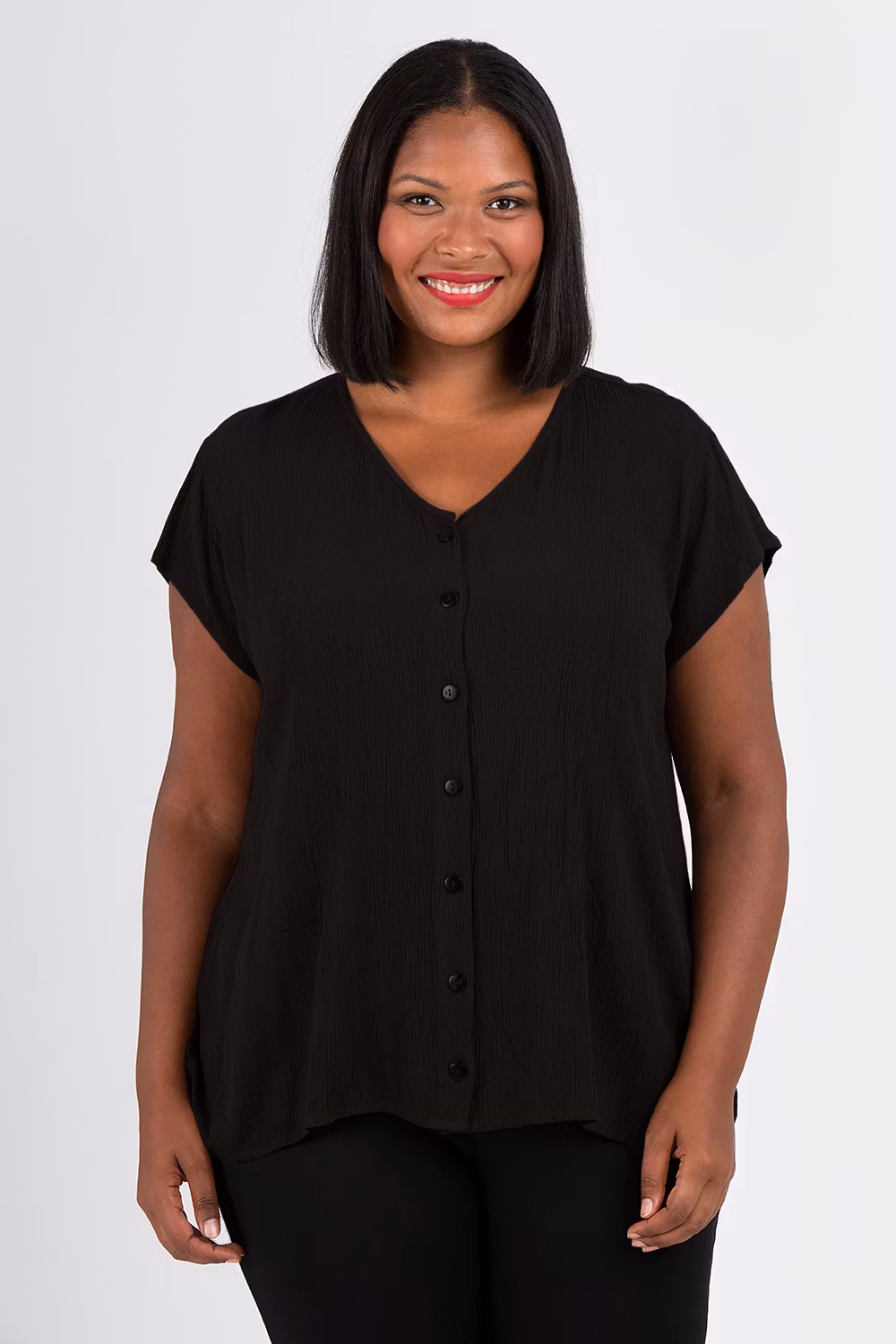 - V-ringad modell med holkärm, rak nederkant och knappar fram.